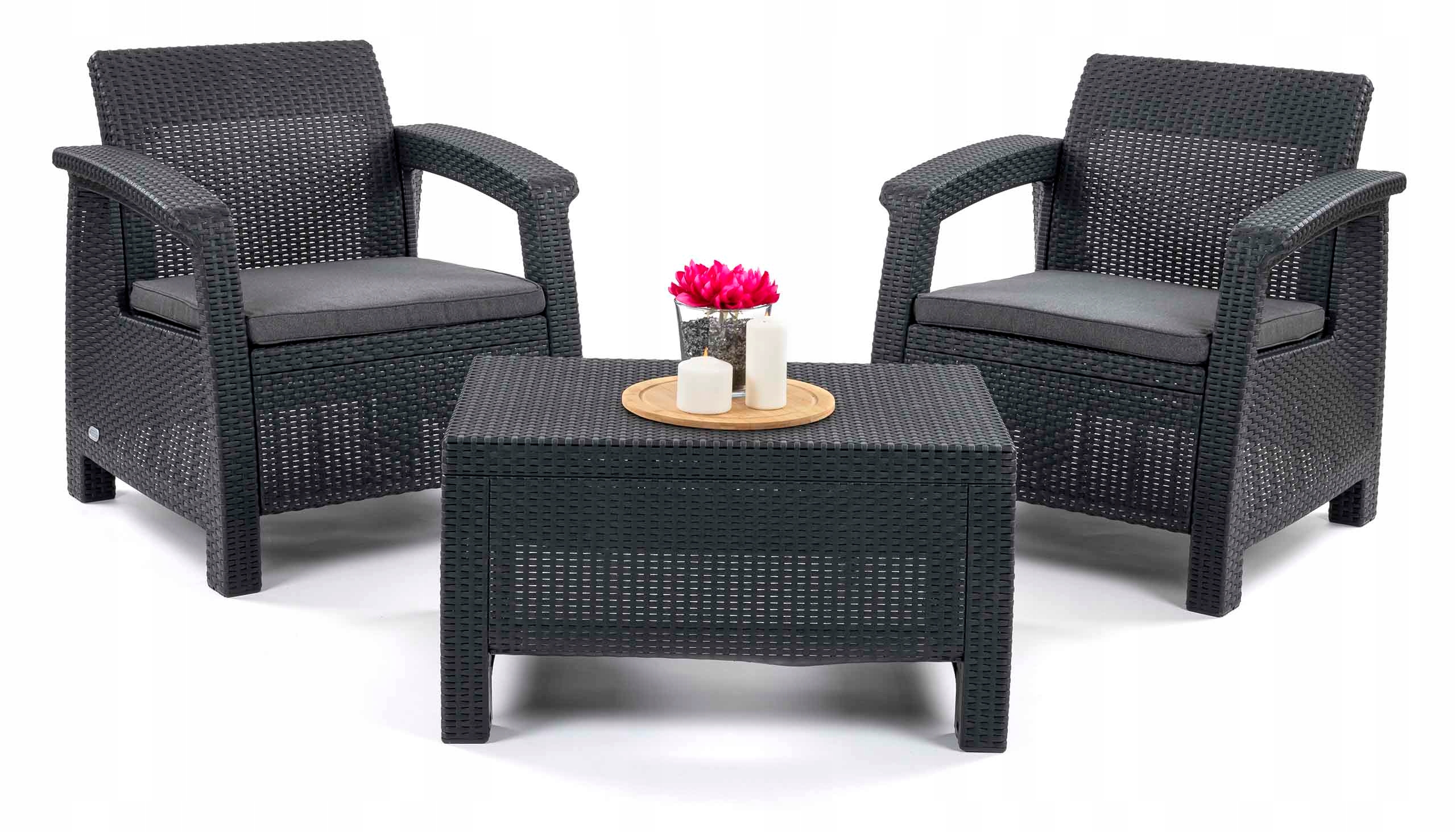 ZESTAW MEBLI OGRODOWYCH DWA FOTELE Z PODUSZKAMI + STOLIK NA TARAS BALKON Zawartość zestawu fotel niski stolik